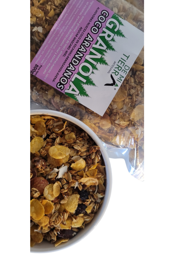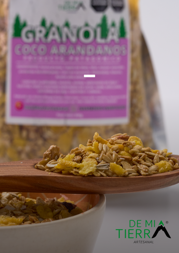 GRANOLA COCO ARANDANOS HORNEADA, AVENA GRUESA, COCO EN ESCAMAS, ARANDANOS DESHIDRATADOS, ALMENDRAS, NUECES, COCPOS DE MAIZ Y MIEL. una granola horneada aromática, crocante y deliciosa. un clásico renovado para tus desayunos y snacks